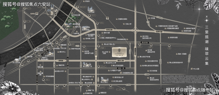 交通枢纽:周边“三纵三横”路网(风情大道、市心路、通城高架+建设一/二/三/四路)无缝衔接滨萧核心区,通城高架、机场公路直抵萧山国际机场及杭州东站。
