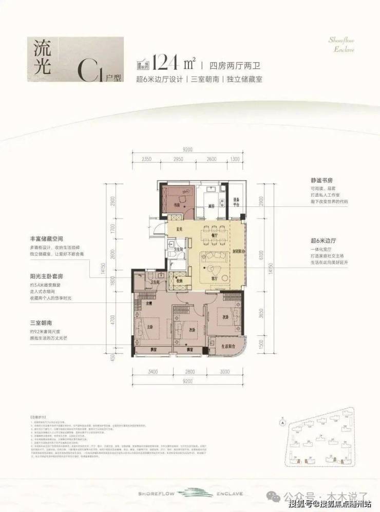 #滨江时舟里,这款户型堪称四开间朝南的“流量王者”,南向面宽约13米,双联阳台+双飘窗设计,视野和采光优秀;套房主卧、双阳光次卧,颇有大平层的气势。
