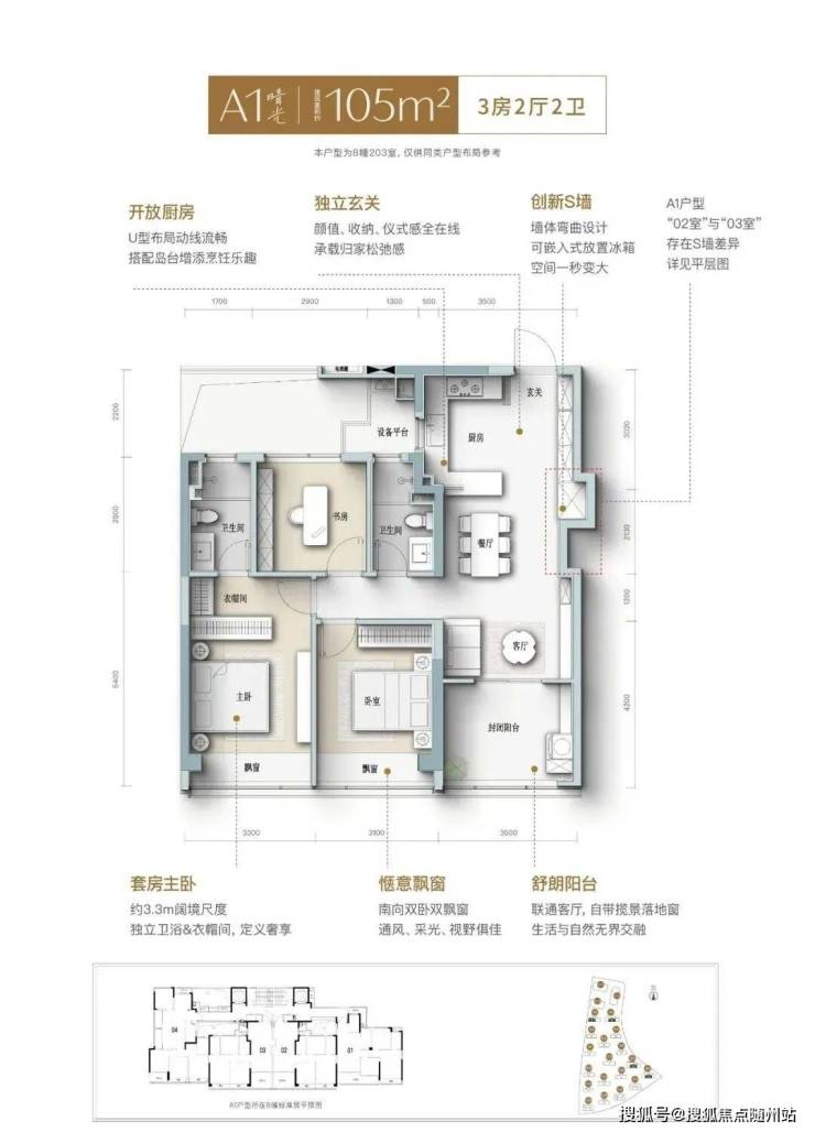 建面约105㎡晴光户型,不仅实现更优面积排布,更做到精神与审美的高度适配。在设计中,这间三房同样拥有南向大面宽,搭配S墙/开放式厨房/一体化餐客厅/多功能书房/酒店套房主卧等,将整个空间的开阔感和互动性做到极致,满足居住者对舒适、安逸的“精准需求”。