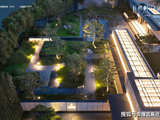 站立于台地之上,知海棠水景沿土地形态形成瀑布、镜面、溪涧等多重形态,浮岛客厅处设置休憩卡座,与前厅形成光影对话,如同三潭印月一般,映于湖心之上,抬高的湖心亭设计,成为舒展园区的一道风景线。