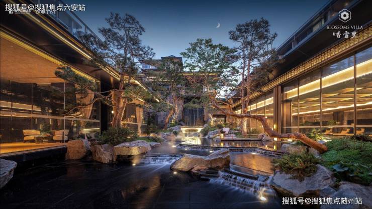 2. 入口营造:主入口以宋代名画《春山瑞松图》为蓝本,打造约50米亚马逊黑奢石景墙,营造隐逸雅奢的归家第一序章。