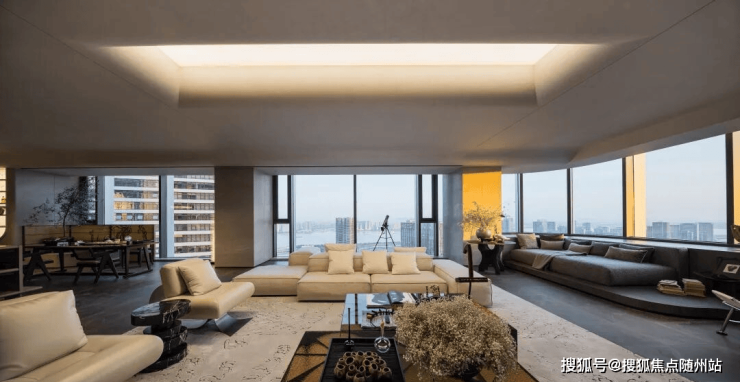 「归逸」560㎡:将闲适哲学融入建筑肌理,6房6卫布局,南向面宽24米,13米弧形巨幕落地窗引江景入室,动静分离设计让心境在进退间自然生发;