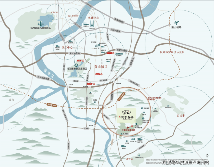 蓝城萧山桃李春风坐拥得天独厚的生态与生活配套,实现 “入则静谧,出则繁华”。生态层面,项目背靠大岩山风景区,周边森林覆盖率超80%,负氧离子年均浓度达城市均值 3 倍以上,同时地处杭州唯一的富硒土地区域,土壤硒元素含量达 0.44mg/kg,是天然的康养宜居胜地。项目毗邻湘湖国家级旅游度假区与 3A 级欢潭古村,周边文旅资源丰富,日常即可享受山水度假生活。生活配套上,项目 1 公里范围内覆盖进化镇中心商超、卫生院、中小学等全维生活资源,可充分满足业主日常居住、教育、就医等各类需求。