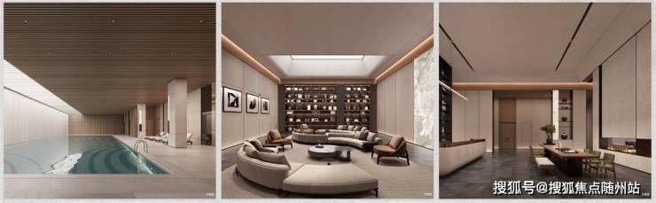 约55米的尺度气场十足,对称排列墨绿色的奢石景墙和羽毛枫,一眼奠定大宅感。再往里是酒店式落客区,一对百年罗汉松围绕着中央的雕塑水景;两侧地下车库出入口,设计了当下最时髦的“星空顶”车道。作为现房,西湖逸庐约1100㎡的下沉式会所已经全部呈现:恒温泳池、健身房、瑜伽室、棋牌室等功能一样不落。