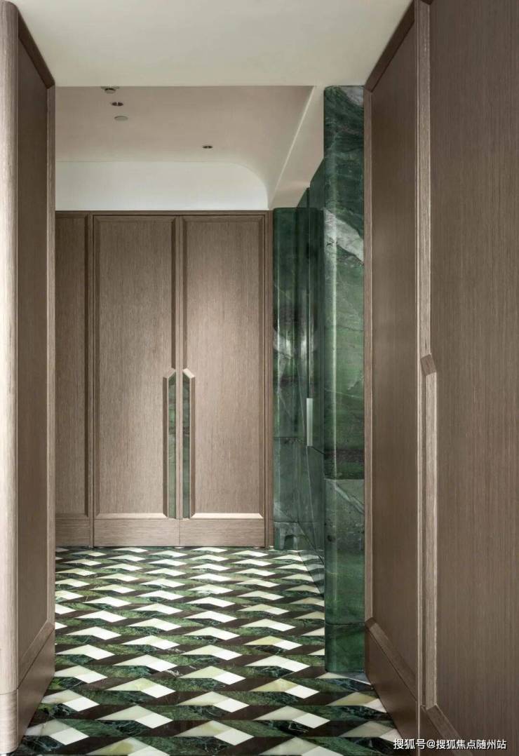 入口处木饰面装饰的墙面,门把手内嵌百达翡翠的细节装饰,取意杭州山水的朦胧诗意,营造出悠然而深远的居停氛围。当你踱步其中,不仅能体会到无处不在的奢雅与华贵,更能感受到杭州风韵反哺的宁静惬意。