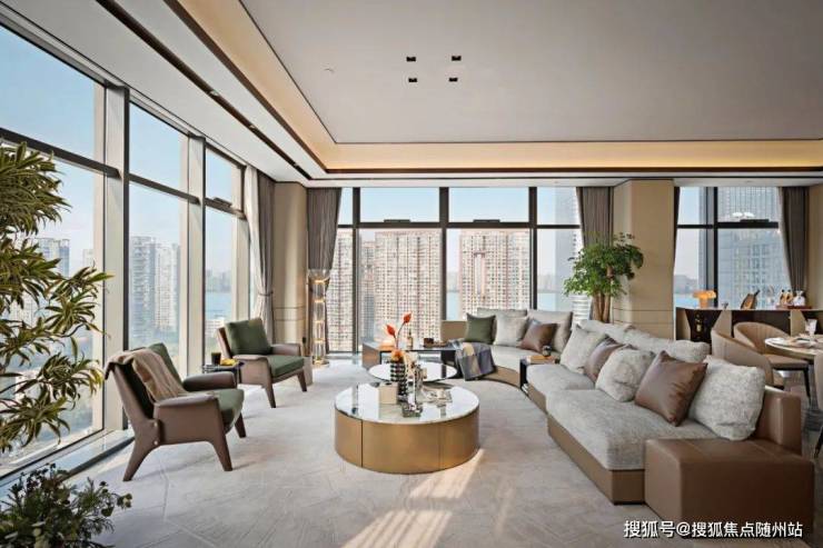 携手绿城江南里原班团队,以“钱塘潮”为灵感,外立面采用全玻璃幕墙+香槟金铝板,打造建面约350-450㎡精装平层。4.19米层高、270°环幕曲面窗揽江景,主厅演化成U形双转角落地窗,如IMAX巨幕环抱钱塘江,获评“中国建筑工程装饰奖”。