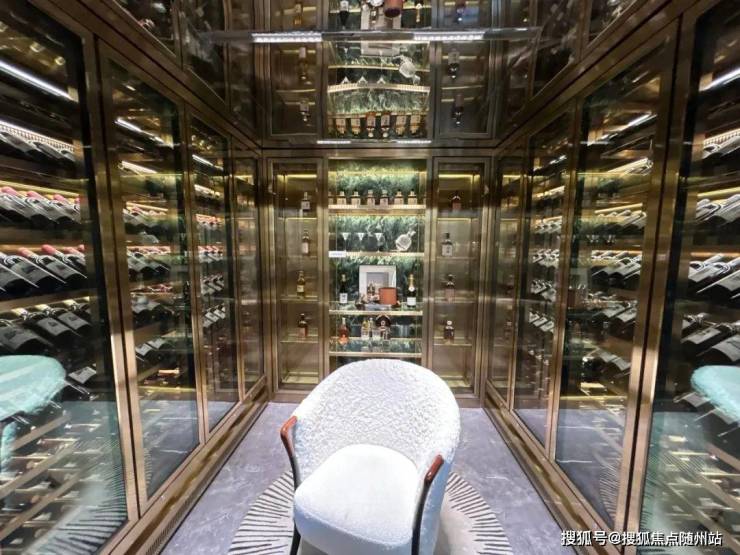从静心凝神的茶室走几步,就到了藏酒饮酒的开放式会客空间,墙上橱柜码着主人从各处精心搜罗回来的上等佳酿。