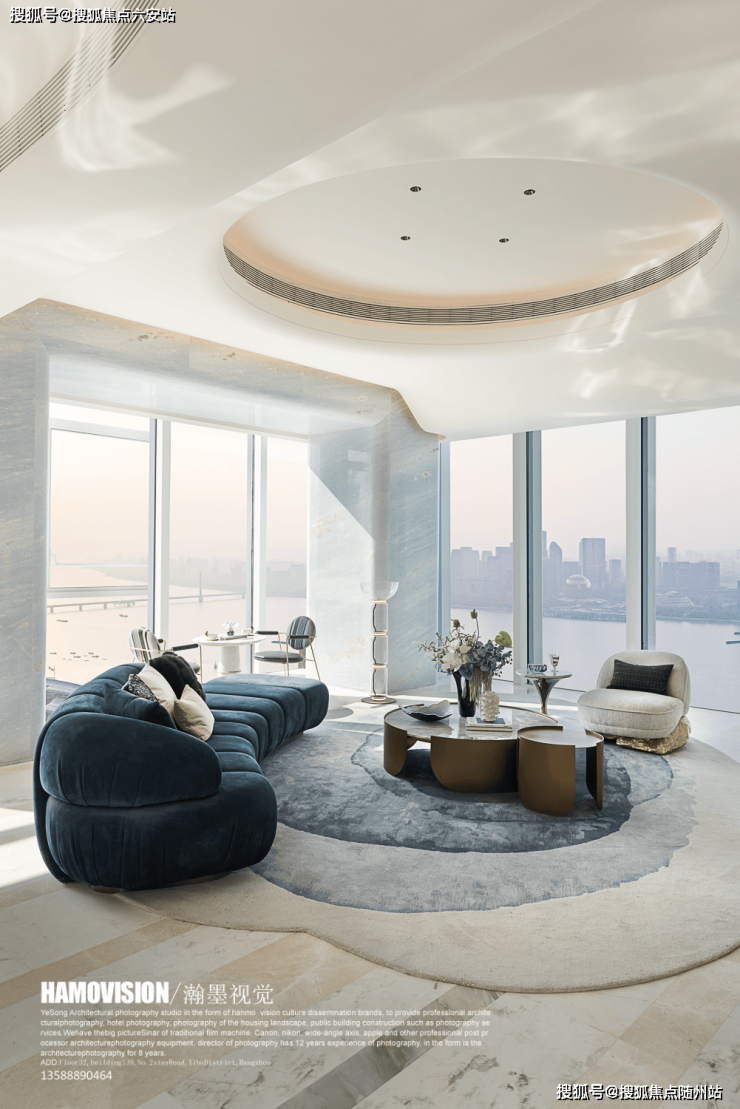 约4.2米的从容层高,赋予空间呼吸感与仪式感;流动的曲线语言,从立面延展至天花,勾勒出柔和且富有张力的场域轮廓;灵活可变的场景模块,则回应着居者动态的生活剧本。
