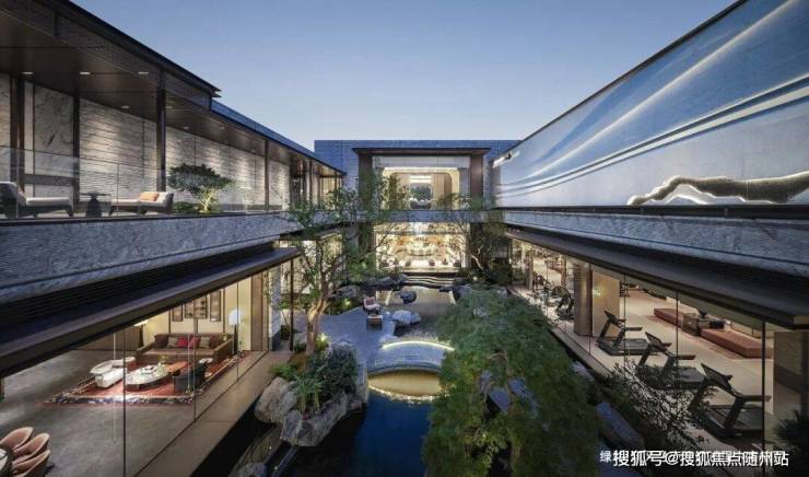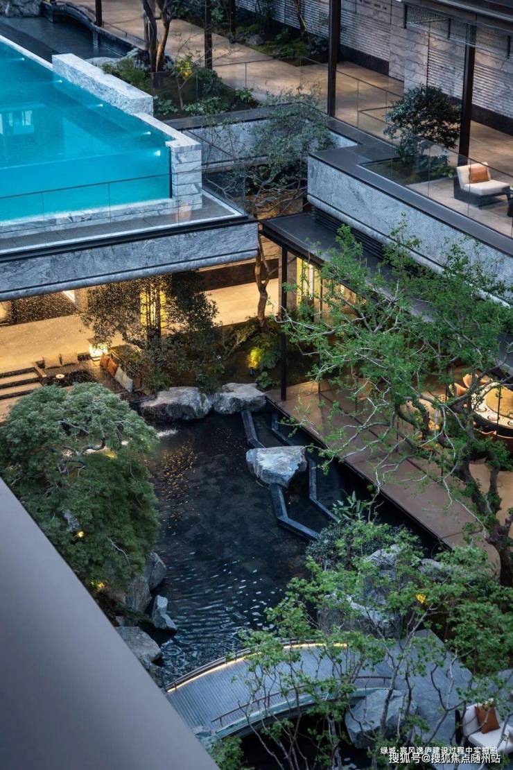 缓步入内,复刻南宋夏圭《溪山清远图》的美学灵魂,引水入园,打造约150米中央景观水系「松壑长风」。还有面积约520㎡的下沉庭院,以十八学士山茶花沿涧种植,如同一幅「涧水鸣珮,山茶照影」的东方长卷。