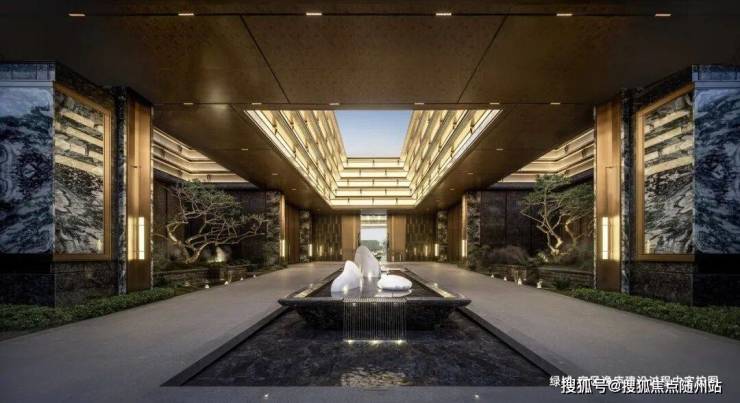 门庭之中,别有洞天。五块汉白玉镇石立于庭前,呼应「五福临门」;顶部「四水归堂」的天井设计,整个入口如同一座「聚宝盆」。