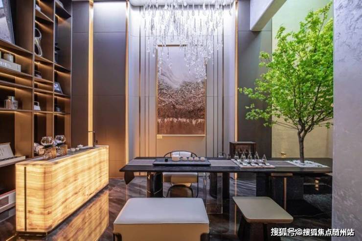 客餐厅采用一体化设计,通过石材、影木、皮革、金属、玻璃等不同材质在光影下的交织,形成张弛有度的现代轻奢多元的场景体验,内敛优雅,充盈着浓郁的都市质感。
