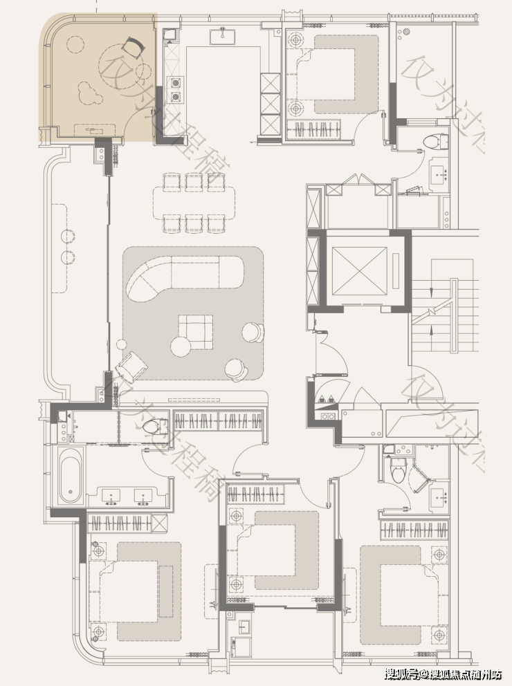 天澜传序府建筑面积约265方的户型,更是直接就做出了大平层,才有的尺度感——