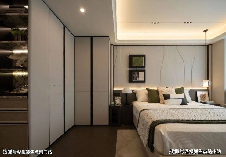最后,是它藏在细节里的“美商”。全屋无主灯设计+弧形吊顶,客厅和主卧做了“ 双背景墙”。玄关柜、主卧衣柜全是交标,用上了 编织纹皮革+冷翡翠岩板