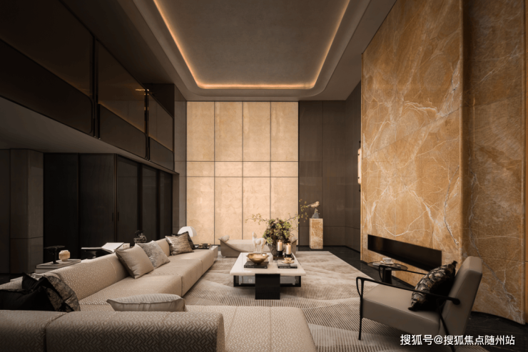 地下会客厅,东方雅奢与现代艺术的交融之美,奢石墙面赋予空间朦胧混沌之感,与线条简约的家具呼应,既是对立元素的共生体,也是东方哲学在当代语境下的诗意松弛。