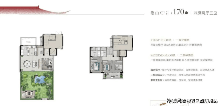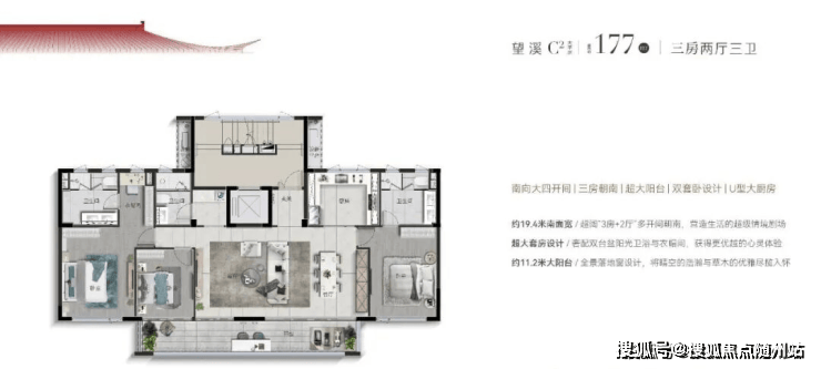 上叠C3户型“花源”建面约177㎡,正如名字一般,四季如花盛绽:一层南向约5.6米大阳台,北向超6米大进深露台;二层南向约5.6米大阳台,北向约3.65米大进深露台;顶层奢配近100平米超大露台,三重露台格局,赋予空间不同层次感的景观奢享体验,大手笔珍贵难觅。