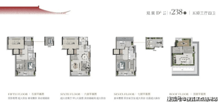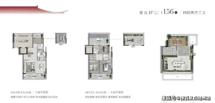 上叠(建面约156-177㎡):屋顶露台+全景窗,尽揽天际线