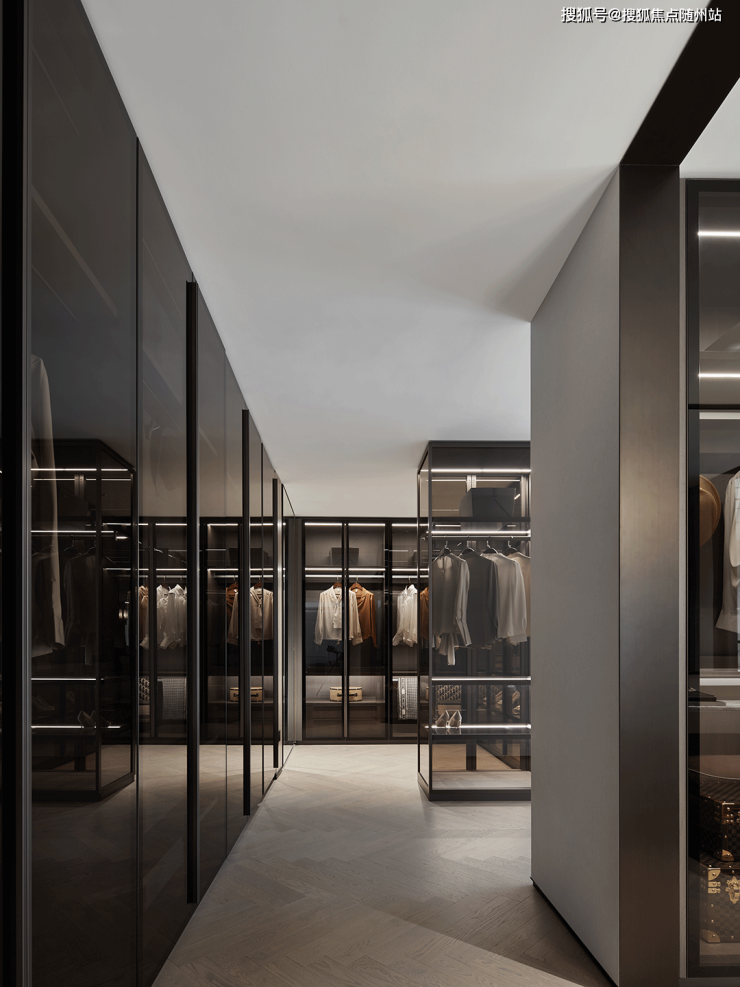 从主卧延伸至主卫的步入式衣柜,给予空间更强烈的结构感,对设计美学和功能主义的揉杂进行重新诠释,也将精致生活的幸福主旨排列而开。深色玻璃和金属边条的搭配,给予一丝神秘,透露出隐逸内敛的调性。