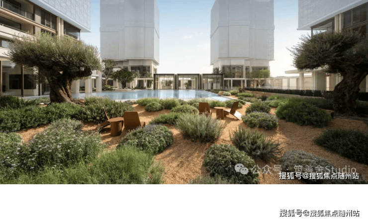 作为首个度假风情的住区,璟逸汲取希腊安缦酒店与Gundari度假村的精髓。素雅的米白石壁墙引领访客,穿行于水院与连廊之间,步入白色莱姆石建筑群,冰蓝水面与沙生植物交织的闲适景致,仿佛将圣托里尼的暖阳拥入怀中。入口处显眼的“矮大紧”树种,介绍说是有上千年树龄的油橄榄,这类树种单棵价格起码有250万,相当的豪气。
