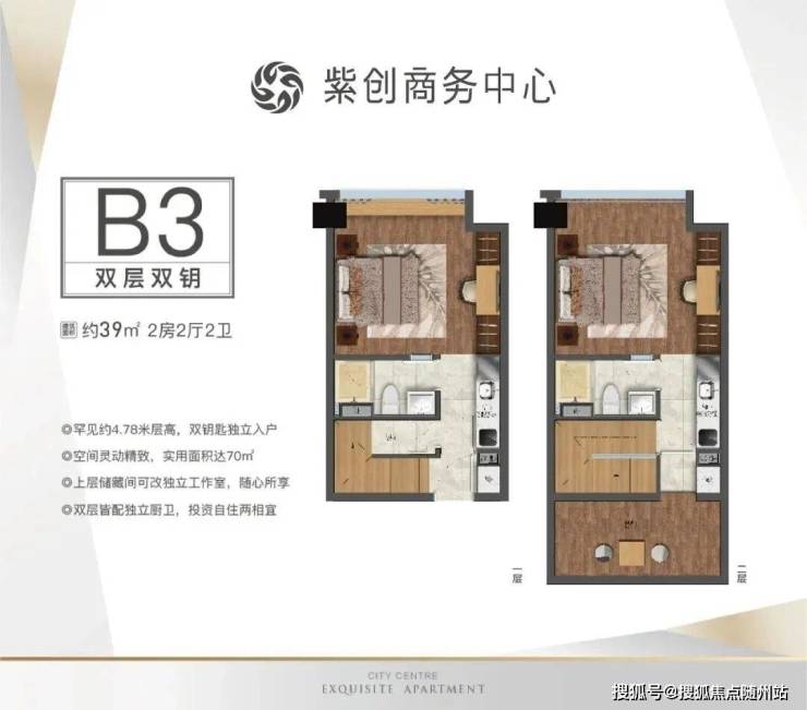 在户型设计上,紫创中心(紫荆宸光)展现了极高的产品力。项目主打建面约35-75㎡的双钥匙公寓,这是一种极具前瞻性的产品设计理念。