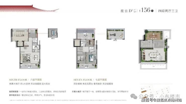 上叠(建面约156-177㎡):屋顶露台+全景窗,尽揽天际线