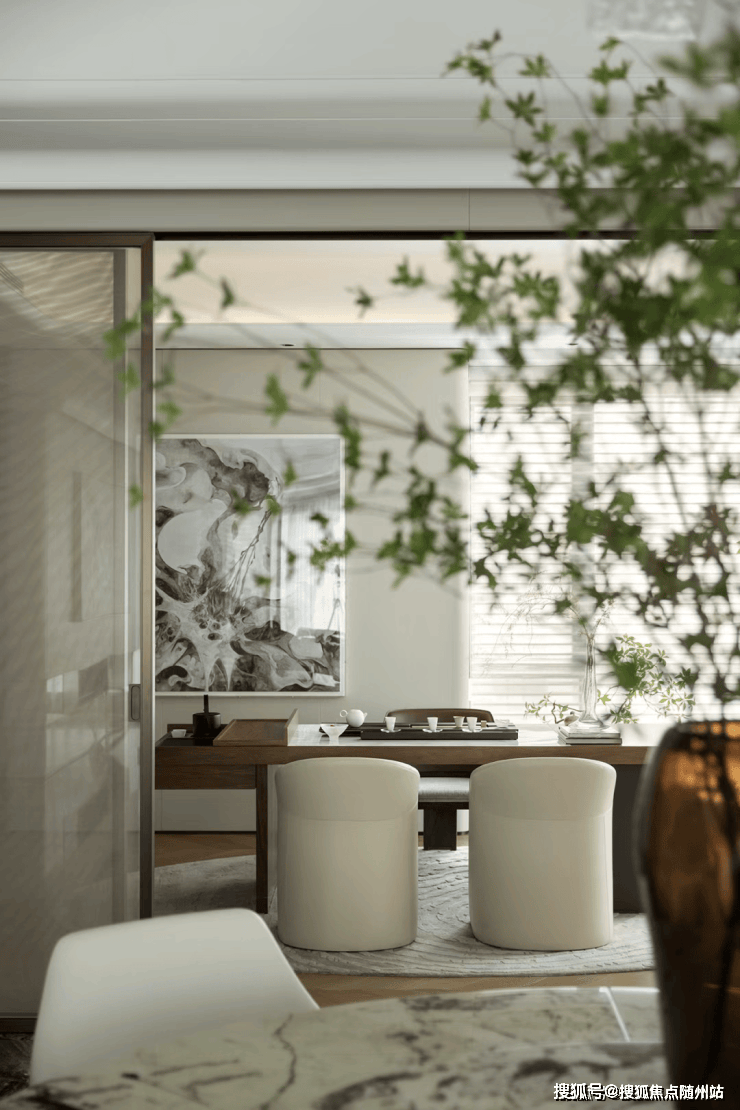 建面约 322㎡东边套,以运河石拱、坝子桥檐脊、河畔银杏为灵感密码。推开双开装甲门,「方圆有度」玄关便以大漆工艺装饰画与「花开富贵」艺术玻璃装置,勾勒出东方意境的雅致轮廓。