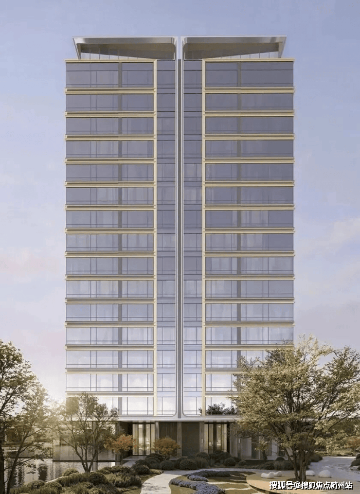 超流体立面,铝板建筑,三面大尺度玻璃与铝板交织,270°无柱转角飘窗设计,公建化极简风格,超流体屏立面勾勒轻盈之姿,呈现与岛屿共生的悬浮质感。