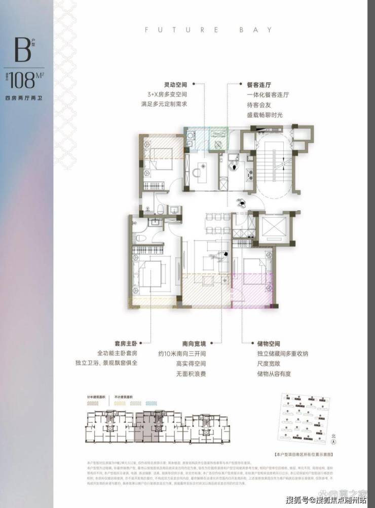 作为“主力王牌”产品,建面约108㎡户型采用去过道化设计,空间灵活可变,可打造开放式厨房拓展家庭场域,适合年轻夫妇;也可将北向书房与次卧融合,变身双孩套房,灵活适应家庭成长需求。