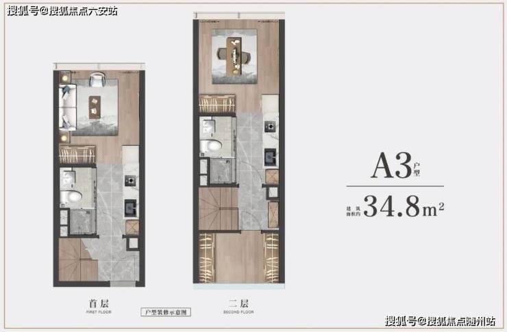 主力产品为建面34-59㎡双钥匙精装公寓,4.79米挑高设计实现“买一层享两层”,得房率高达82%。下层可作共享办公或商业展示,上层为私密居住空间,满足年轻创客、投资客及小型企业主多元化需求。