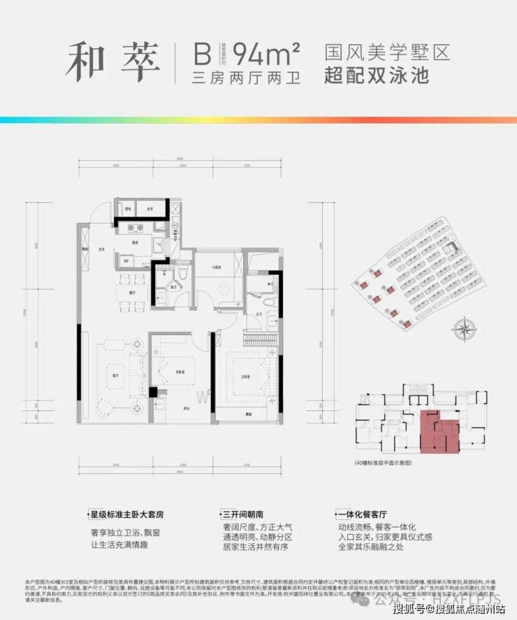 山水·颐萃别院容积率1.5,分为高层和排屋两个区,高层区总共6幢住宅,只规划了三款户型:建面约95方、约97方和约111方。