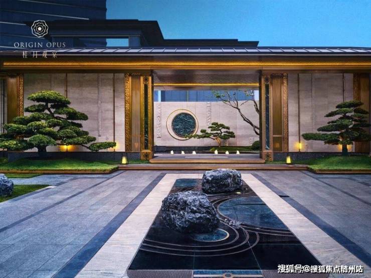 月影江南 灵韵入境:入户两侧水景清泉涌动,婉转迂回,一座精致的宋风美学馆展示在眼前。透过门框衬映出满月景墙,甄选名贵奢石,在虚实掩映间延续着东方诗意山水的写意画卷。