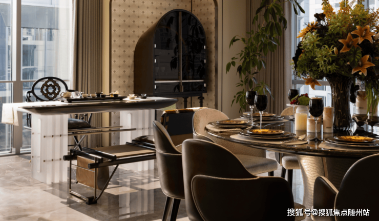 设计师郑仕樑以新海派风格为笔,将东方雅致与国际视野融于每一处细节,让空间不再只是居所,而是承载家族记忆与精神共鸣的容器。这里,“繁花”主题贯穿始终,从入户玄关的拱券造型到主卧的贝母漆酒柜,从双面落地窗引光的客餐厅到南向三套房的私密布局,无不印证着“天然去雕饰”的高级感。