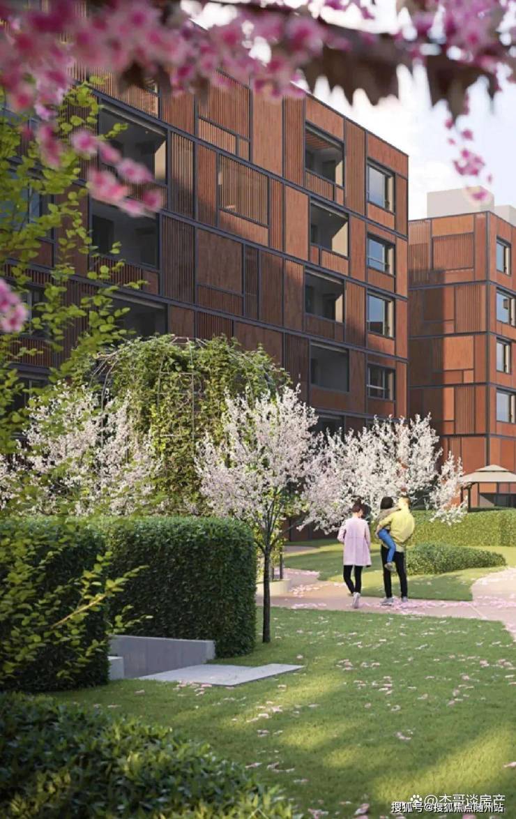 18栋6层木色调叠墅呈镜像排列,外立面采用竖条木纹与玻璃幕墙结合,致敬工业美学;