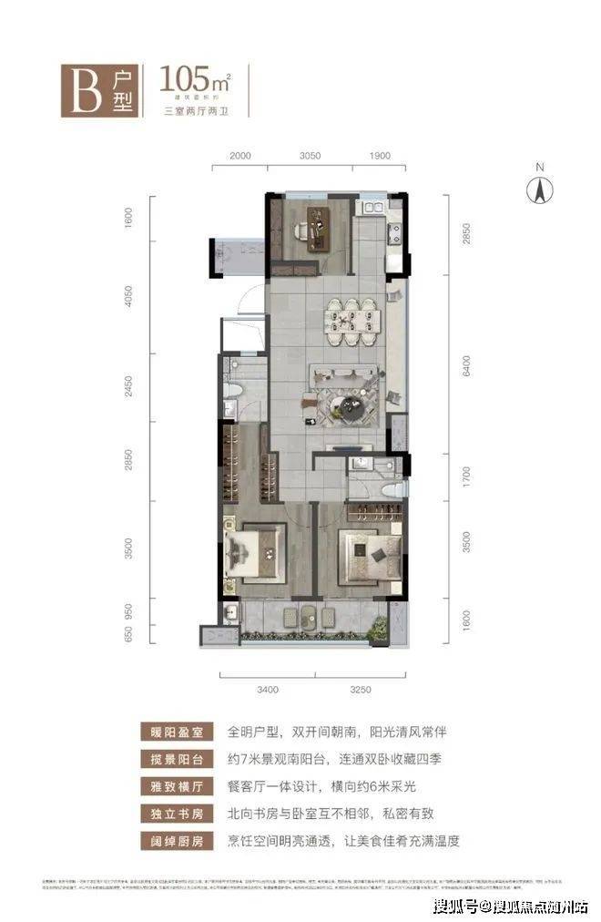 建面约89m²全能大三房,主次卧空间充沛,主卧套房式设计、三开间朝南向、双卫设计,空间多得;建筑面积约105㎡大三房全明户型,双卧朝南、拥约7米南向景观阳台、餐客一体横向约6米宽幅采光。更高的得房率,安放生活多重逸趣。