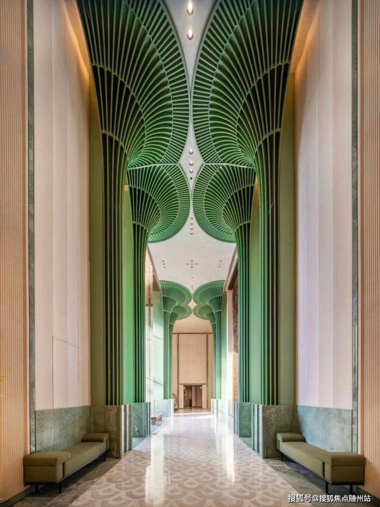入口礼序:9.6米高朱炳仁手工铜门,复刻钱塘潮纹,配百达翡绿奢石屏风。
