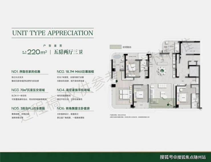 约220方得房率近91%,主要得意与阳台内包,扩大了客厅面积,可以看到南向约18.7米超大面宽+5.9客餐厅开间,空间十分阔绰。