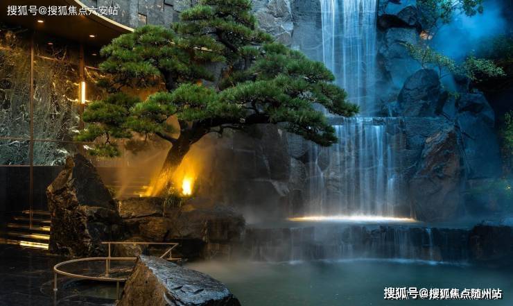 入口处7米高悬瀑飞流直下,600吨中国黑原石堆砌营造的叠崖景观,与全冠移植的珍稀植物共同诠释自然与艺术的完美对话。