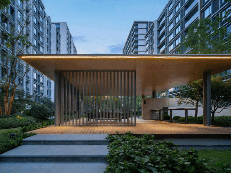 硕大的中央景观廊架,不仅是一处绝佳的欣赏风景的场所,也是业主日常沟通交流的重要平台。置身于这样的场地,哪怕只是作一些寻常的交谈,也会让人觉得平添了几分优雅和乐趣。