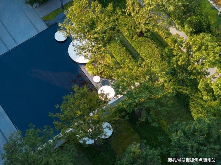 波光粼粼的水池,潺潺流水随着绿枝摇曳的风声款款晕染。业主日常归家迈入的第一步,不知不觉之间,心情就会自然放松下来。
