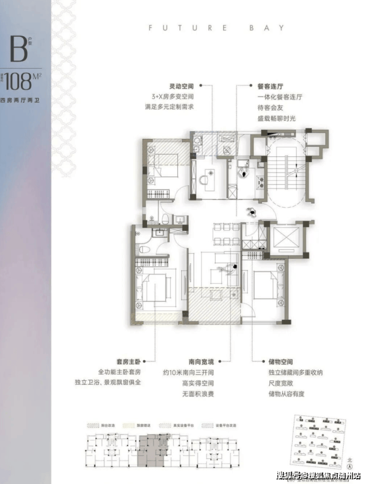 约108方户型:四房两厅两卫:为3+X灵动户型,无连廊设计,确保南北通透,功能分区清晰。采用四叶草布局,卧室分布于四角,互不干扰,保障隐私,同时标配入户储藏间。
