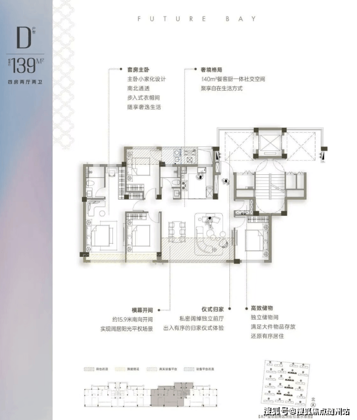 建面约139㎡户型:四房两厅两卫:约15.9米南向面宽,近五开间朝南,采光通风极佳。有三南卧设计且动静分区,老人房与主卧分设客厅两侧,避免相互干扰,还标配入户储藏间。此外,约6.4米阔尺横厅,餐客厅一体,可摆放8人餐桌。