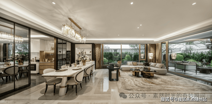 一层为客餐厅和一个带独立卫生间的套房,层高约3.4米非常舒适,客餐厅为L型的大面落地玻璃,妈妈端着菜放到餐桌上的时候,就能看到孩子在室外玩耍。