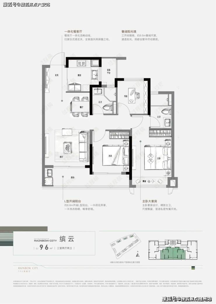 建面约96㎡的3房户型,总价维持在170万起的低门槛,对新杭州家庭价格也是难得友好的门槛,同时还把实用性做到了MAX,约9.8米的南向尺度让一体化餐客厅与两间起居室都沐浴在充沛的自然光下。