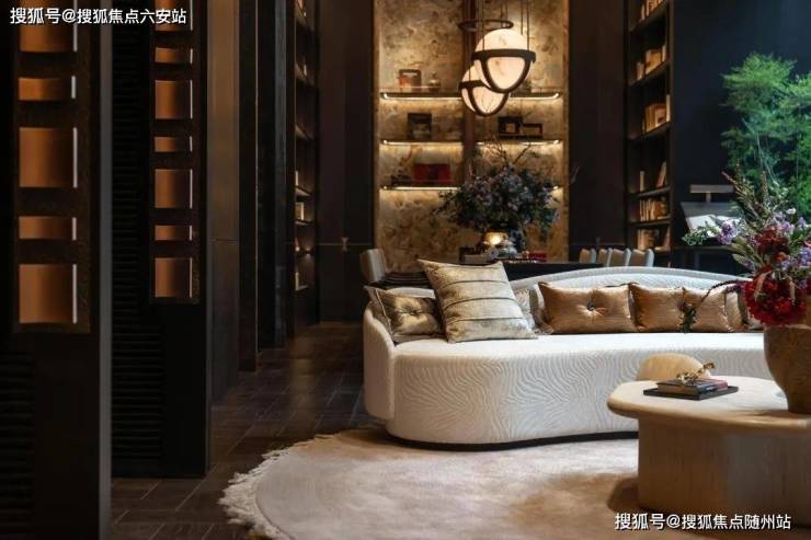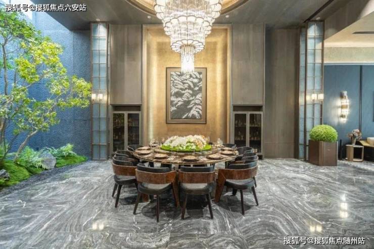 景观以“四境四巷”铺陈东方礼序,“五重归家”轴线串联宽约128米恢弘门庭、约15米叠石飞瀑、约13米榫卯转译现代穹顶等节点。约1300㎡下沉式庭院采用三层立体观景设计,15米叠石飞瀑再现《溪山行旅图》山水意境;私宴区铜丝钉珠绣吊灯璀璨生辉,泳池底部3000余片马赛克拼贴渐变艺术,历经数十道工序打磨。