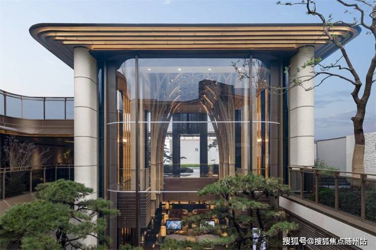 项目以“江南地标色”精研立面美学,20余道工艺淬炼天青陶板,复刻南宋汝窑釉色,辅以鎏金铝板、如意云纹镂空格栅、紫点金麻石材,让建筑本身成为“会呼吸的艺术品”。社区内,黑松迎宾开启“松间画屏”的宁静序章,斗拱、榫卯、拱门等东方元素转译“舒卷归堂”的美学,约15米超尺叠瀑倾泻而下,以“银河叠水”奇观展现动态的《溪山行旅图》意境;下沉茶室静对流水,独拥“月映听泉”之幽,让每一次归家都成为“穿越山水”的仪式。