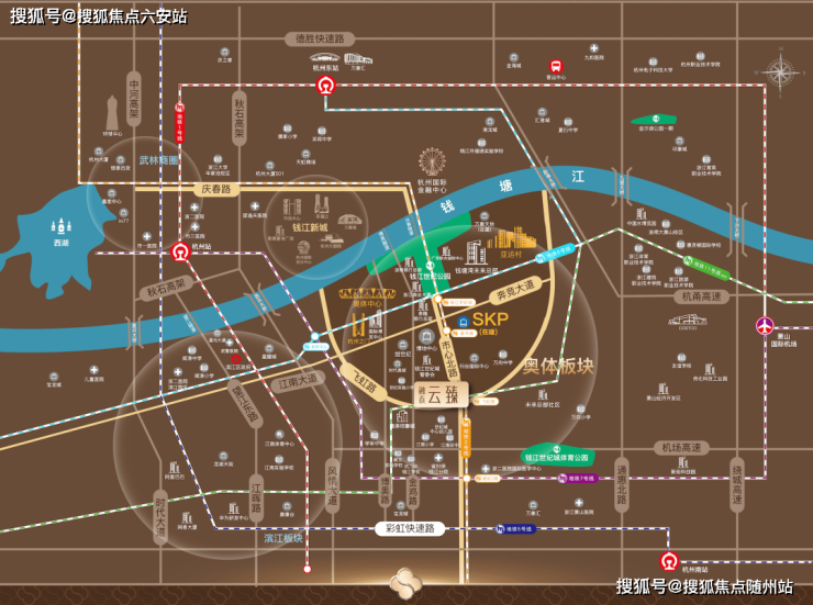 地理占位:项目位于杭州萧山区钱江世纪城奥体核心区,与钱江新城合称“杭州CBD双核”,毗邻地铁2号线飞虹路站,是TOD上盖项目,地铁出口直达地下室。