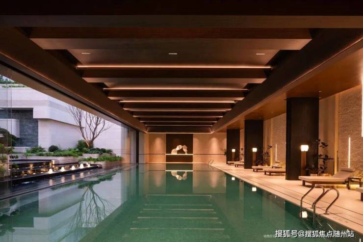 约1100㎡的下沉式会所是项目的“隐藏彩蛋”,其中的无界泳池设计通过可开闭玻璃门,实现开放式结构,与下沉庭院水系连成一片,游泳时与自然景观融为一体。