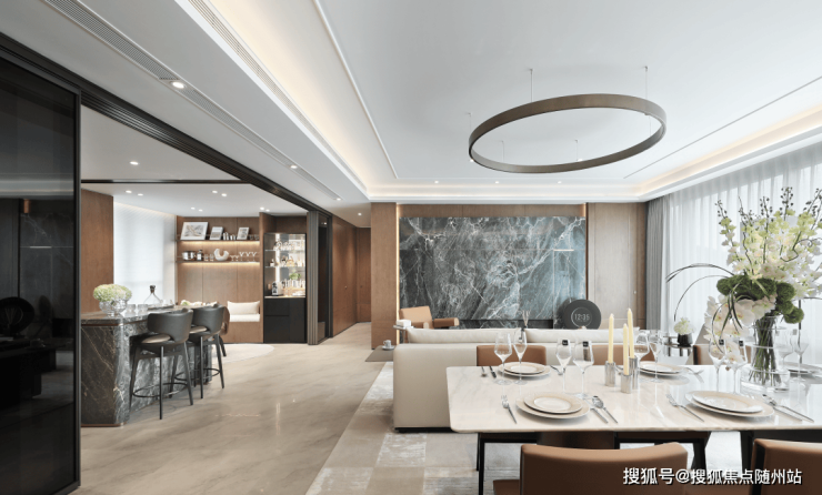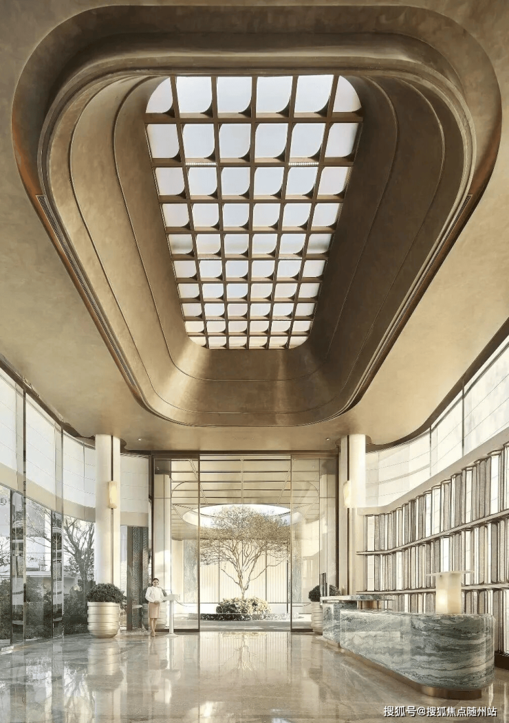 社区主入口是超宽幅门头,宽约 80m 高约 7.1m,两侧的维多利亚绿奢石以及中央的白雪公主透光石很吸睛,浅色的部分则是贝金米黄石材,圆弧的工艺处理也更显温润及价值感,中央栽植的超大紫薇树拥有约60年树龄,底部则是采用宝格丽黑奢石作为基座