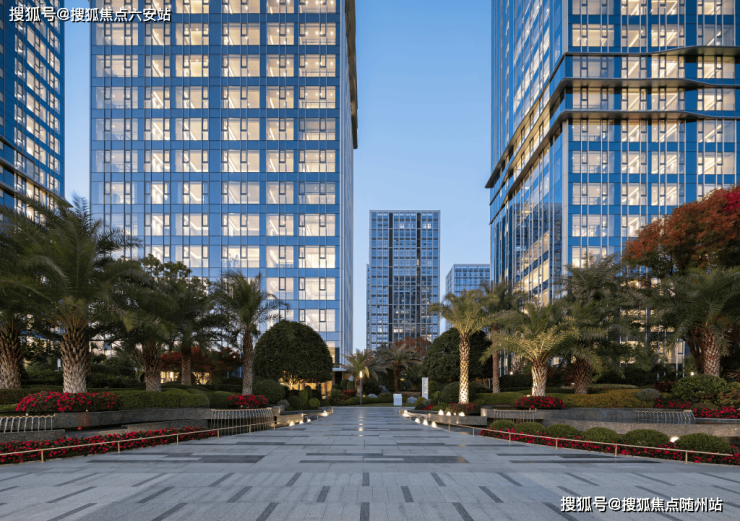 入口处的迎宾水景是园林的点睛之笔,池底设计为盛放的牡丹图案,周边种植着从10000多公里外移植而来的加那利海枣树,瞬间提升了园区的度假感。夜幕降临时,池中满载星河剪影,与周边的高品质建筑内透光相映成趣。
