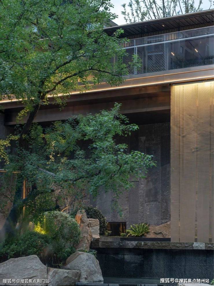 一进社区大门取意宋代二坡顶形制,透光奢石立面与沉木米黄景墙横向延展,古朴肌理与苍劲造型松形成“石木对话”。二进廊下庭院还原《万壑松风图》意境,松林阵列与精工格栅构筑风骨场景。三进庭院雨打芭蕉,檐语时光。四进沉浸式下沉式会所以高山流水为幕,通过层叠水景与立体山石,复现《溪山行旅图》觅得知音的沉浸场景。