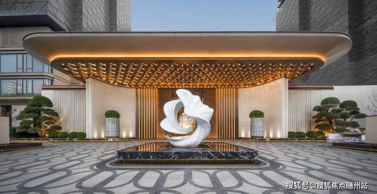 魔都美学立面:金色铝板+石材拼接,40米奢雅门头,三重归家仪式感;